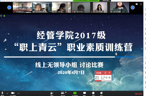 为帮助学生在疫情防控期间,树立正确择业就业观、做好生涯规划、提升求职就业能力,伟德国际1949始于英国举办“职上青云”职业素质训练营系列活动。4月7日晚,“职上青云”——无领导小组讨论比赛在zoom网络平台举办,活动吸引百余名2017级本科生参加。本次比赛邀请到宁证期货副总经理杨鸿岩、AO史密斯招聘主管金鑫、我校就业创业指导服务中心副主任陶琨、经管学院2019级辅导员康冲担任评委,对学生求职就业中的常见问题以及如何在无领导小组面试中脱颖而出进行细致讲解和精心指导。